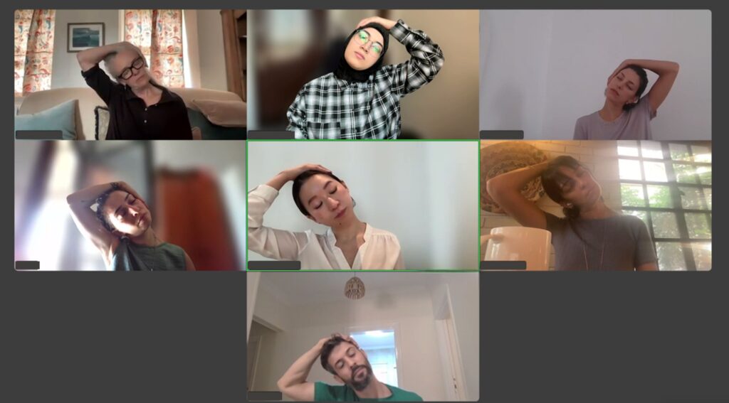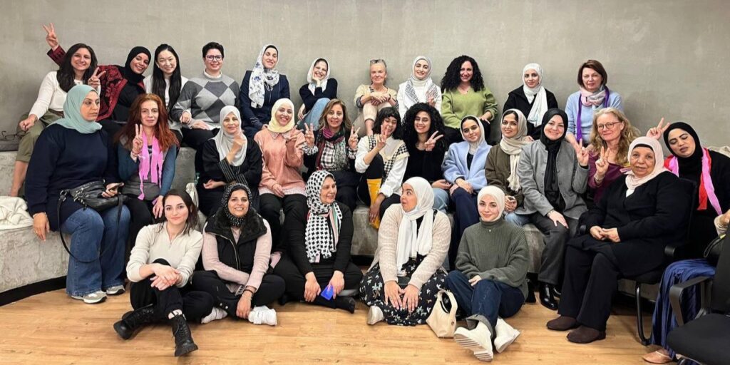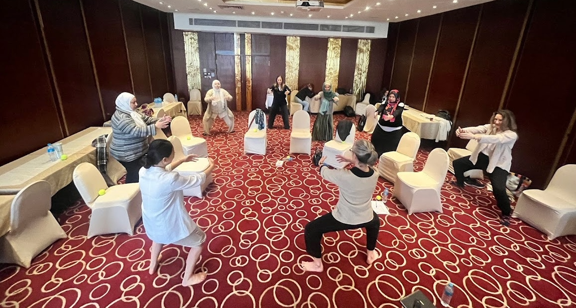 Alexandra and Justine co-leading polyvagal exercises during a self-care training for staff from NGO partners Ghassan Abu Sitta Children’s Fund and Wings for Hope